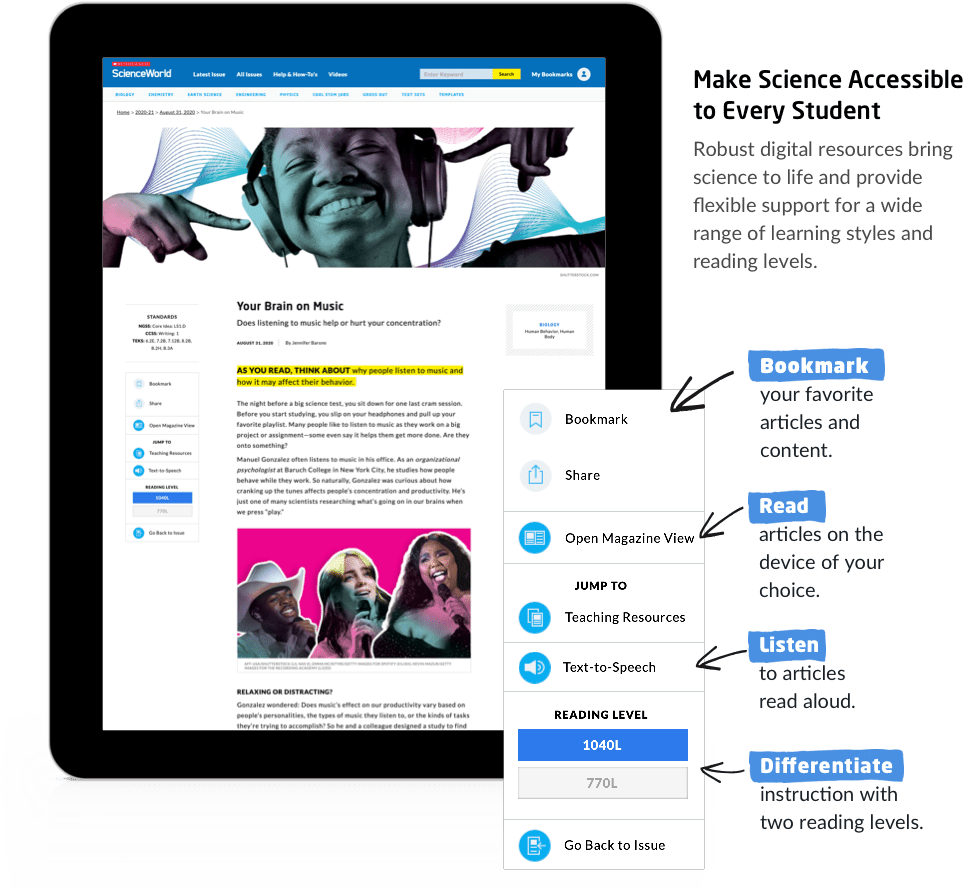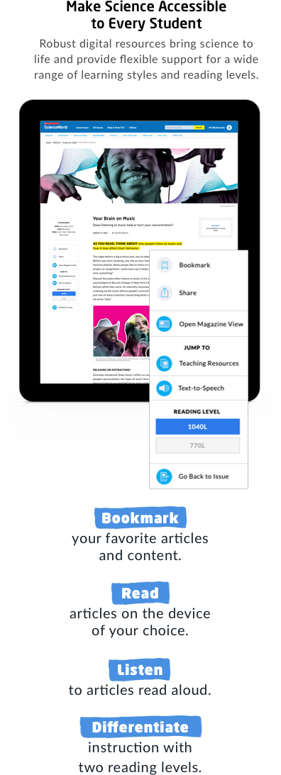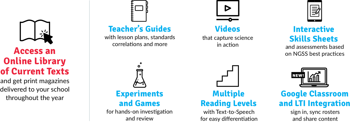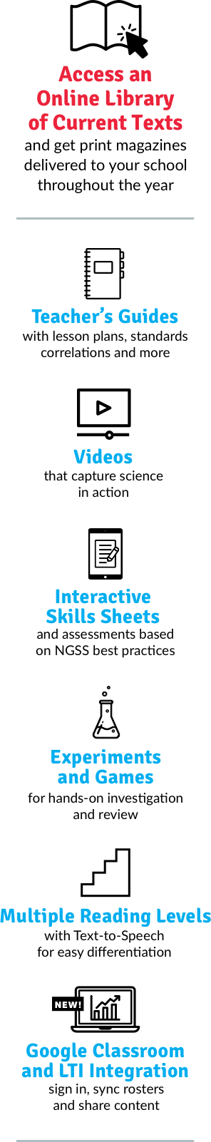 Wherever your students are, bring science concepts to life and engage them in science and engineering practices. Each feature story comes with print and digital resources that help you meet your teaching objectives in any learning environment.