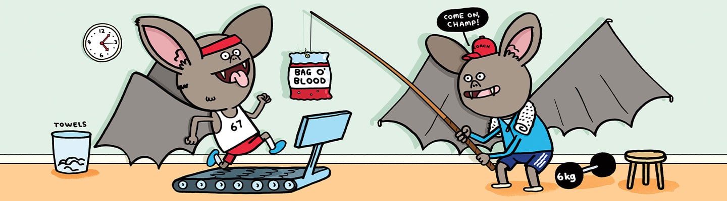 On a warm summer night in Mexico, a herd of cattle slumbers in a field. With hardly a sound, a tiny, winged creature flutters down to the ground from a nearby tree. It’s a vampire bat! The small animal could fit in the palm of your hand, but it has a big appetite—for blood. The bat slowly creeps along the grass, toward an unsuspecting cow. Then the bat uses its needle-like fangs to pierce the cattle’s ankle and lap up the blood from the wound.